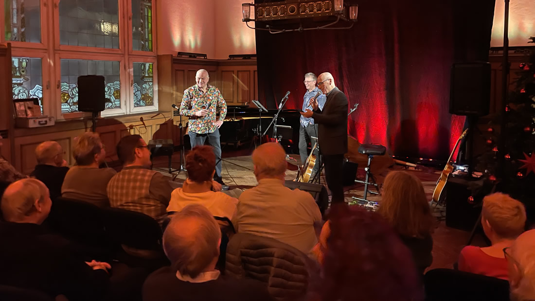 Im zweiten Teil des Abends nahm das Duo Archtop Affairs das Publikum mit auf eine stilvolle Reise durch Jazz- und Swingtraditionen. Dietmar Kunzler (Gitarre, Gesang, Jazz-Panflöte) und Ivo Müller (Gitarre, Gesang) überzeugten mit Charme, Groove und spürbarer Spielfreude. Ihre handgemachte Musik, getragen von großer musikalischer Erfahrung und einem feinen Gespür für Atmosphäre, traf den Nerv eines Publikums, das den Abend mit großem Applaus würdigte. Beide Musiker sind in Völklingen nicht nur als Künstler, sondern auch als engagierte Kulturmacher fest verankert.